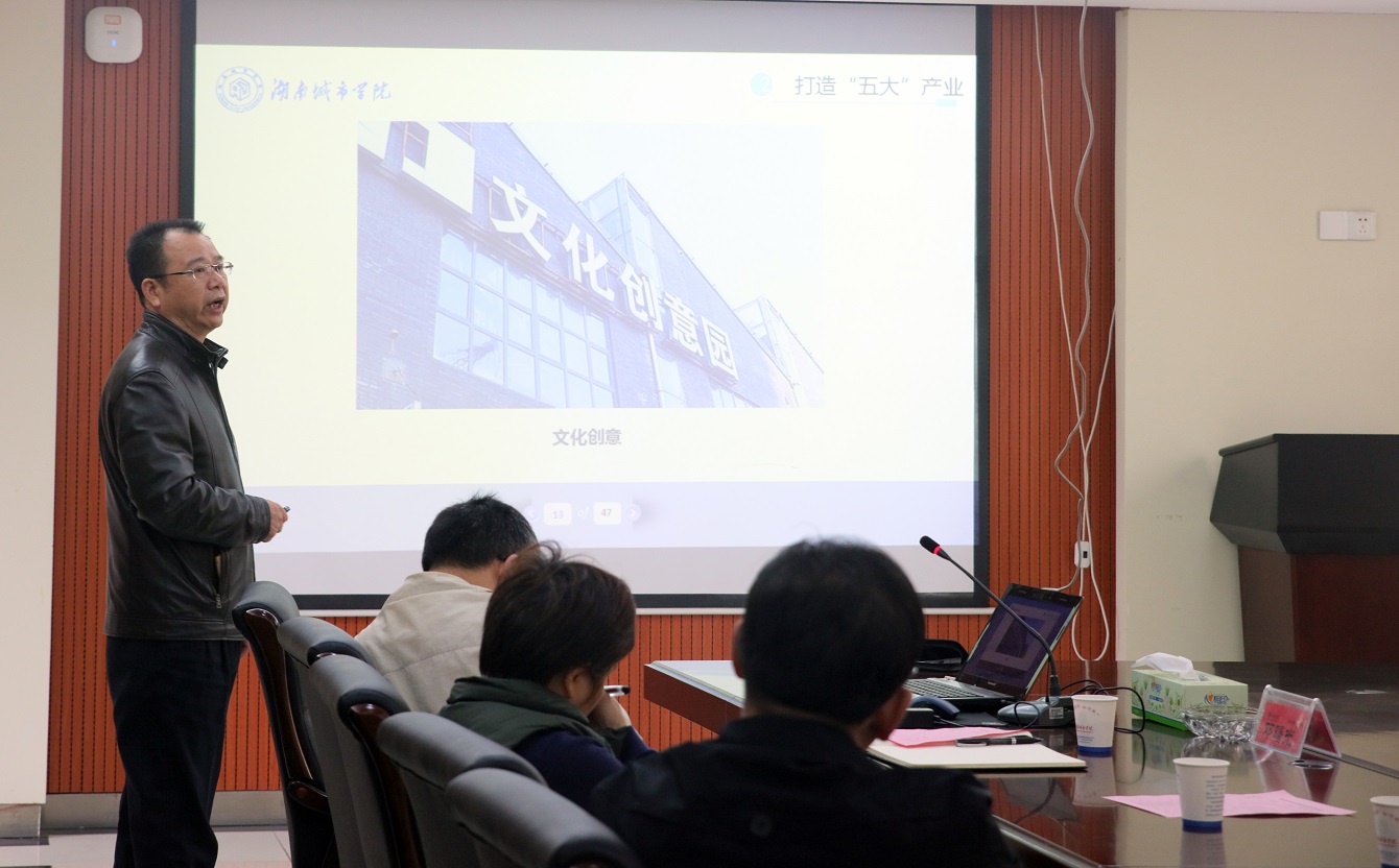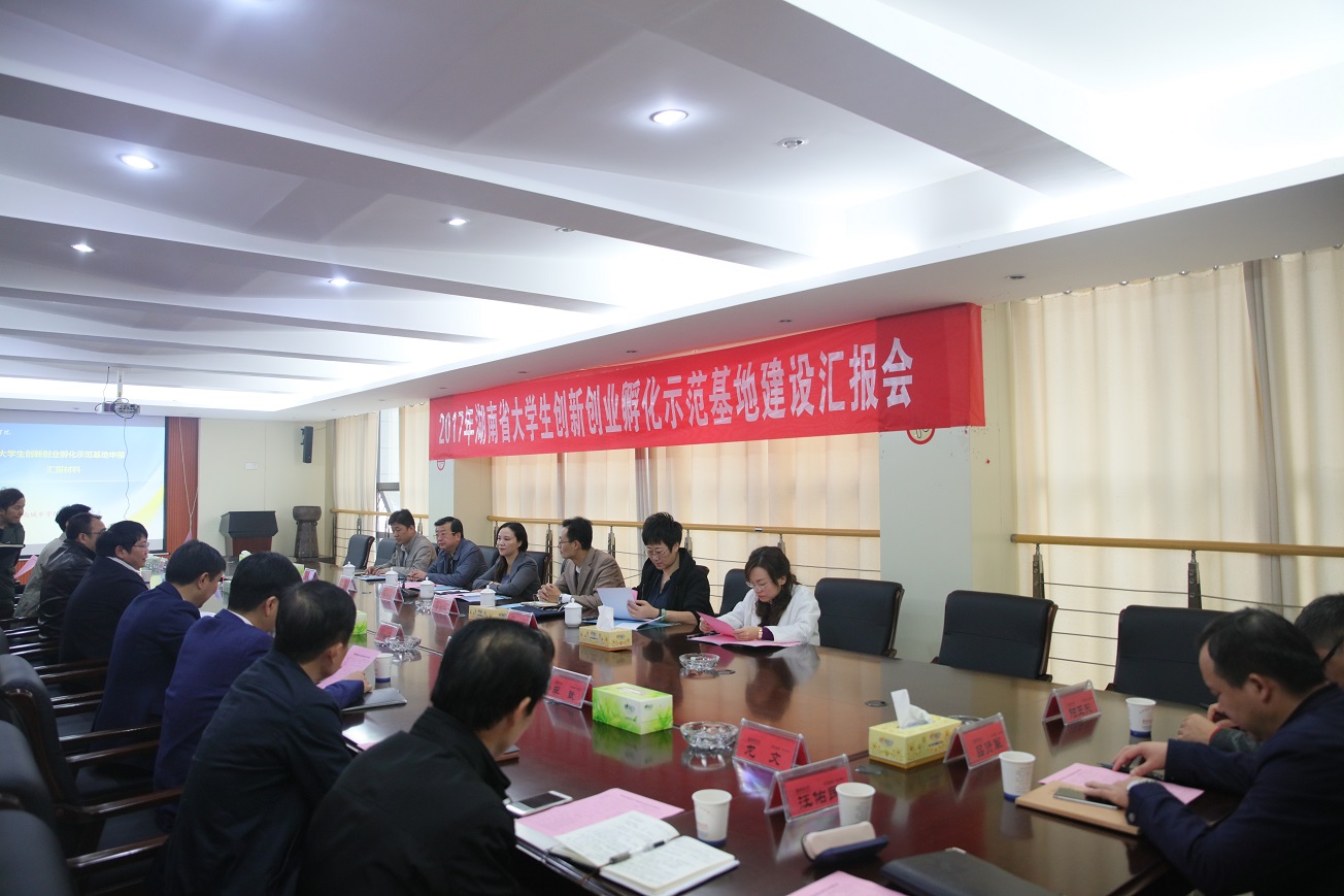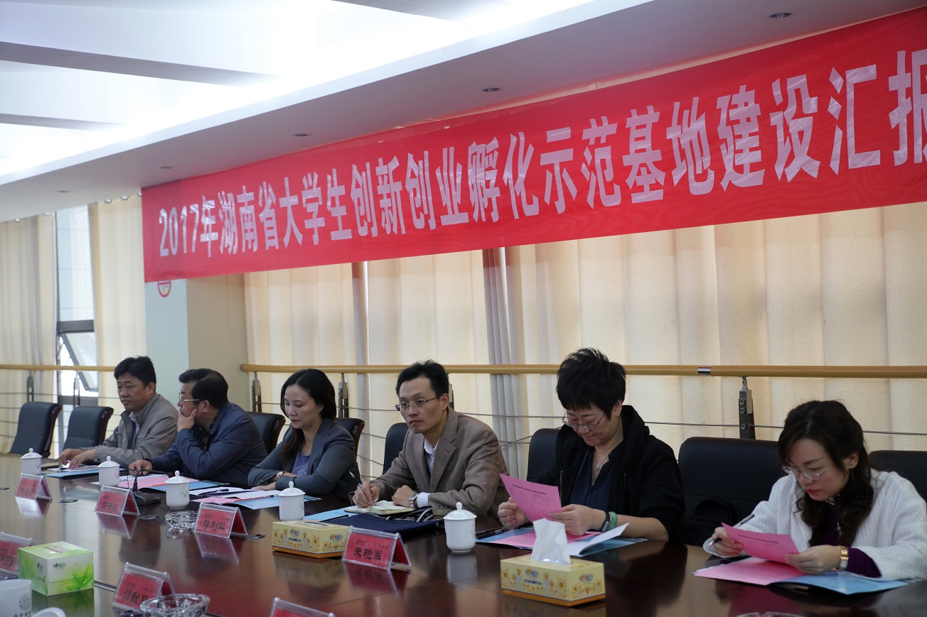 (本网讯)10月23日上午,受省教育厅委托,以湖南人文科技学院副院长石潇纯为组长的2017年湖南省高校大学生创新创业孵化示范基地评审组专家一行六人来校,对我校大学生创新创业孵化示范基地建设情况进行评审。校领导罗成翼、李建奇、郑卫民、何振、谭献良出席会议,党政办、宣传部、人事处、教务处、科技处、学生处、团委等部门负责人,以及建规院、信电院、艺术学院、设计院、应创学院院长参加了汇报会和意见反馈会议。