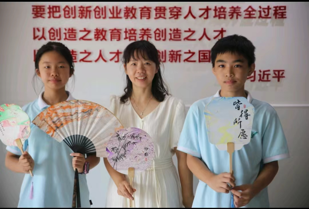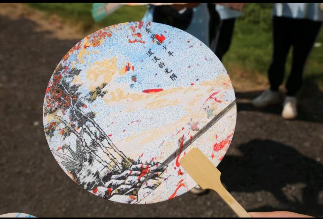 制作环节中,同学们化身“非遗传承者”,认真选料、调色、入水晕染,或旋转,或轻摇,并轻轻吹动,使漆在水面上自然散开。不同的配色、不同的入水方式获得绚丽多彩的图案,使漆在扇面上形成美丽的花纹。晾晒完成后,颜料和墨水就可以充分固定在扇面上,一把独特的漆扇圆满完成。