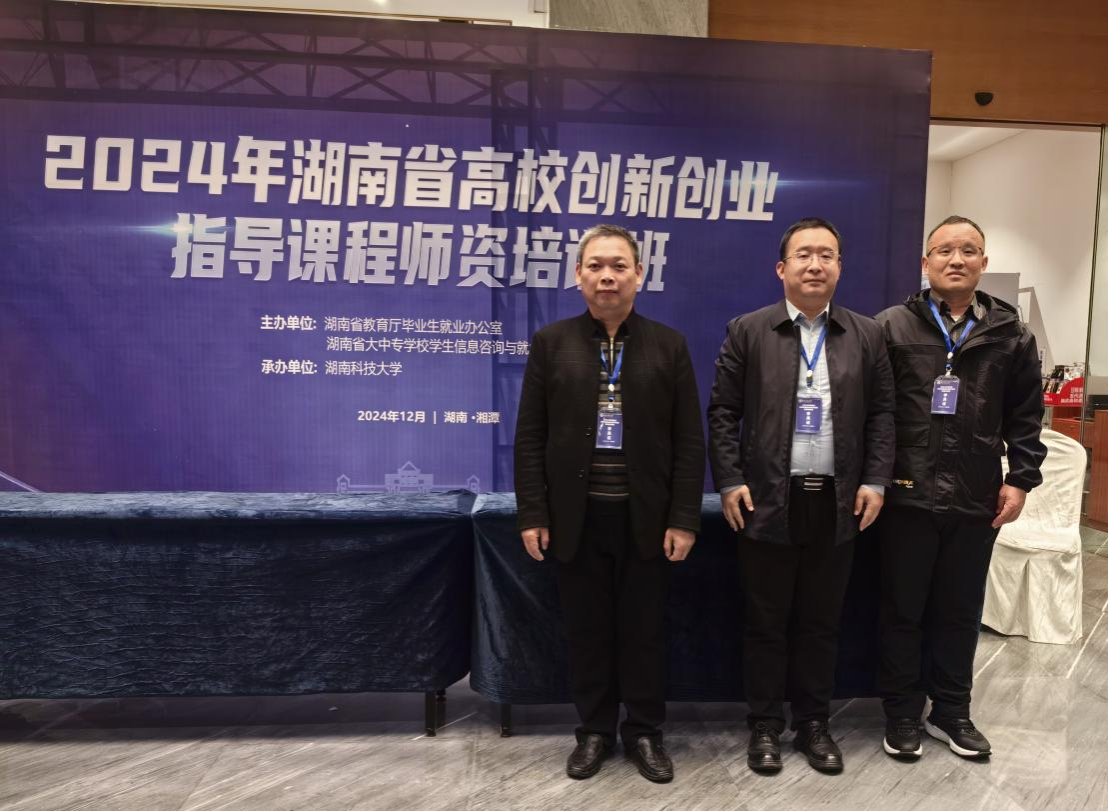本网讯(通讯员 郭自嘉)为进一步推进我省高校大学生创新创业工作,提升高校创新创业指导课程师资队伍建设,省教育厅于2024年12月20日在湖南科技大学举办湖南省高校创新创业指导课程师资培训班(第2期),学院副院长董萌,双创实训专干郭自嘉、孟文鹰参加培训。