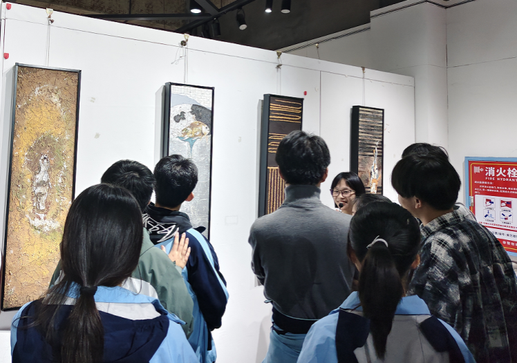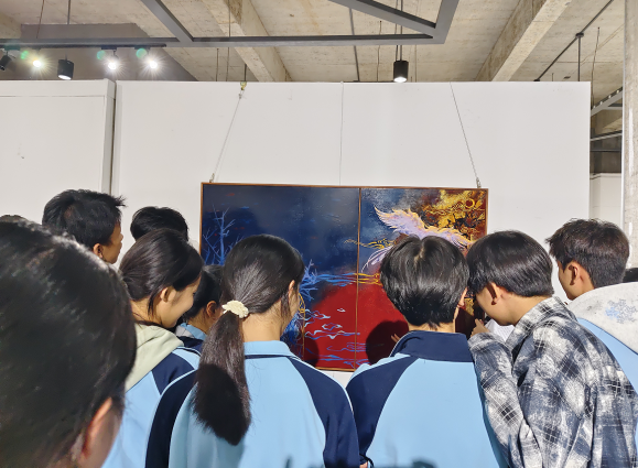 岩彩画展区则带来了别样的视觉冲击。绚丽的色彩、细腻的肌理,让每一幅作品都充满了层次感与质感。同学们伸出手指,小心翼翼地凑近作品,想要感受那些色彩叠加的奇妙效果,好奇地询问老师岩彩画的创作技巧,眼神中满是求知的渴望。