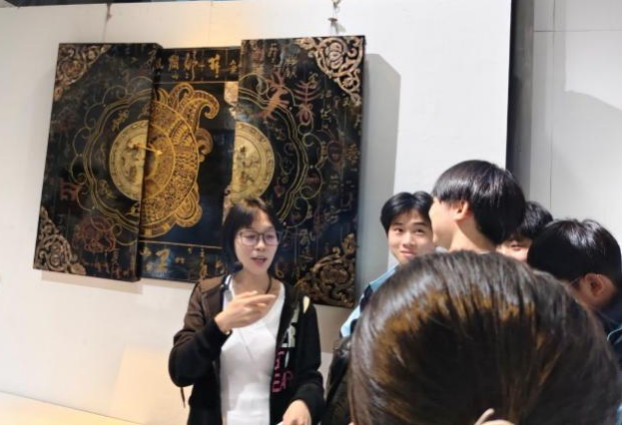 在漆艺作品前,老师向同学们介绍了漆艺的历史和制作过程。“漆艺是我国的非物质文化遗产,有着悠久的历史。制作一件漆艺作品需要经过多道工序,从制胎、髹漆到描绘、打磨,每一步都需要创作者付出大量的时间和精力。” 老师一边说,一边指着作品上的细节,“你们看这些精美的图案,都是大学生们经过层层髹涂、打磨而成,这一副作品至少需要花半年的时间才能完成。” 同学们听后,轻轻抚摸着器物的表面,感受着细腻光滑的触感,感叹他们精湛技艺和对艺术的执着追求。