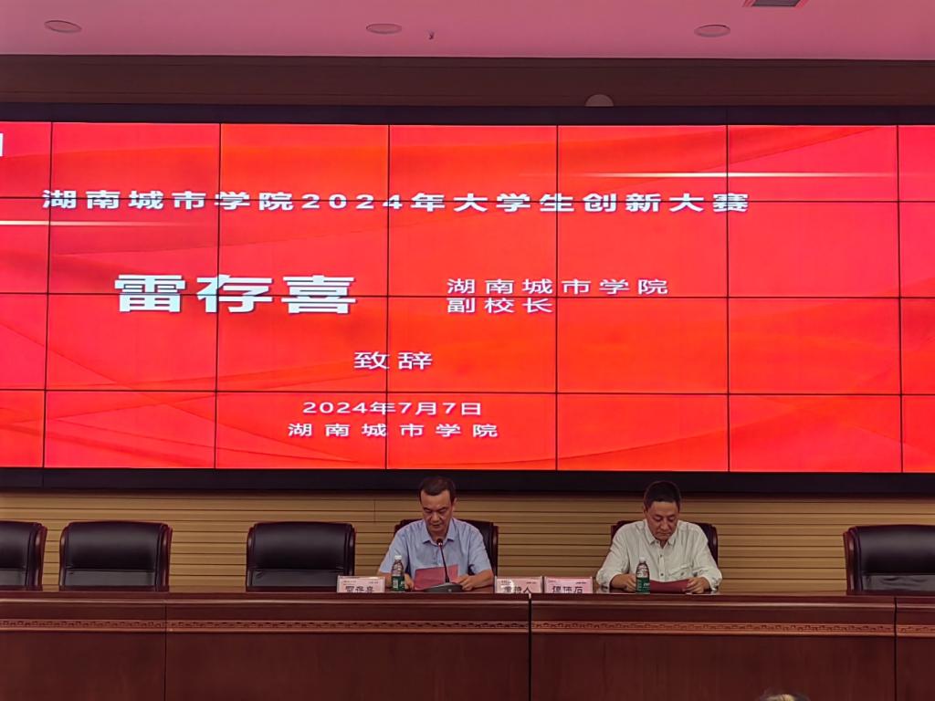 本网讯(通讯员孟文鹰)7月7日,中国国际大学生创新大赛(2024湖南城市学院校赛在图书馆报告厅成功举办,校党委委员、副校长雷存喜出席大赛开幕式并致辞。大赛由创新创业学院院长谭伟石主持。